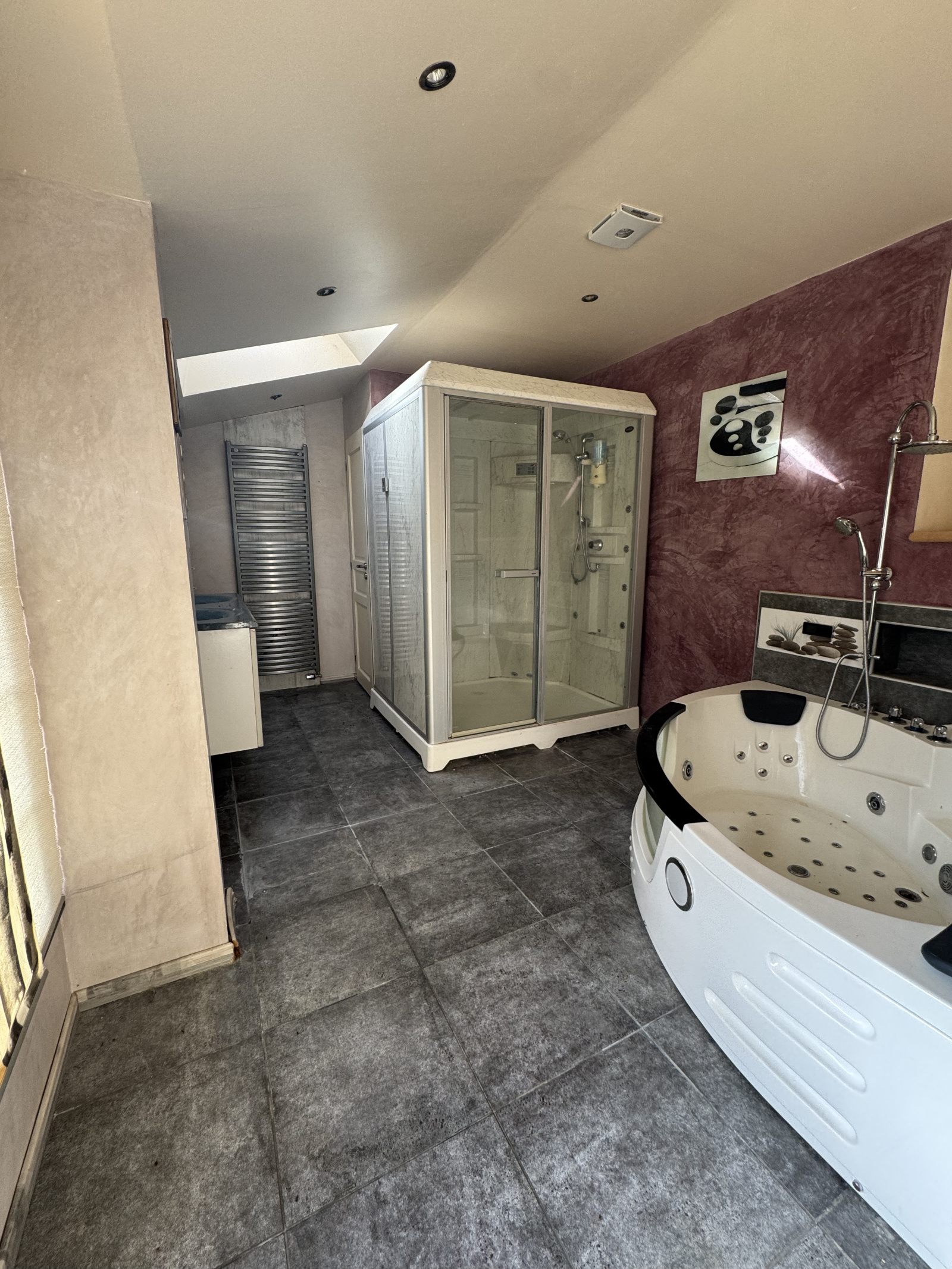 A l’étage, palier desservant deux chambres, salle de bain, WC, une chambre, une pièce passante, une suite parentale avec salle de bain (baignoire balnéo et douche hammam)